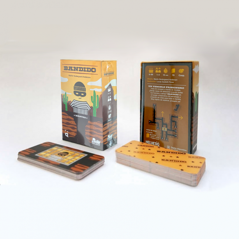 Bandido es un juego cooperativo de estrategia y observación para toda la familia. En su turno, el jugador debe poner una carta que conecte con las cartas ya puestas en la mesa. Todos siguen jugando hasta conseguir bloquear todas las salidas o cuando no queden cartas para robar del mazo. Si los jugadores han logrado bloquear todas las salidas, han ganado el juego. Pero si el túnel sigue abierto Bandido se escapa y ¡habéis perdido!