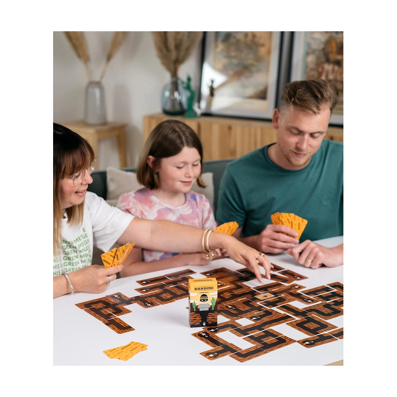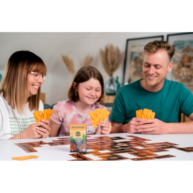 Bandido es un juego cooperativo de estrategia y observación para toda la familia. En su turno, el jugador debe poner una carta que conecte con las cartas ya puestas en la mesa. Todos siguen jugando hasta conseguir bloquear todas las salidas o cuando no queden cartas para robar del mazo. Si los jugadores han logrado bloquear todas las salidas, han ganado el juego.