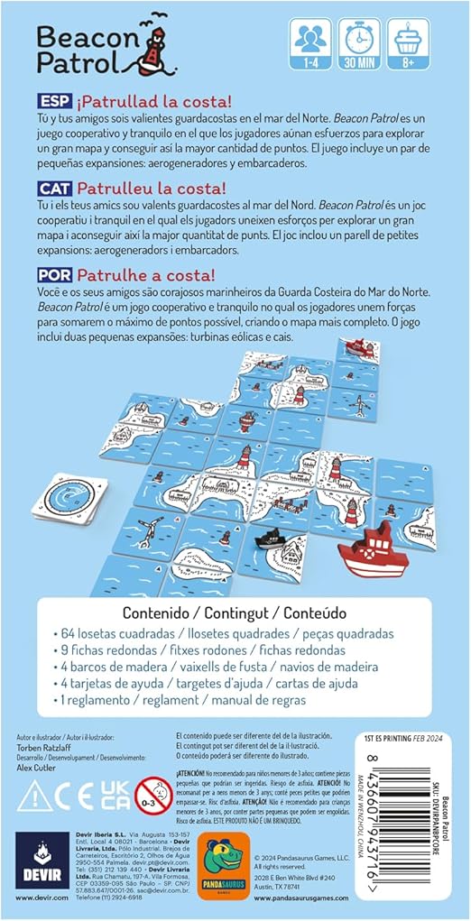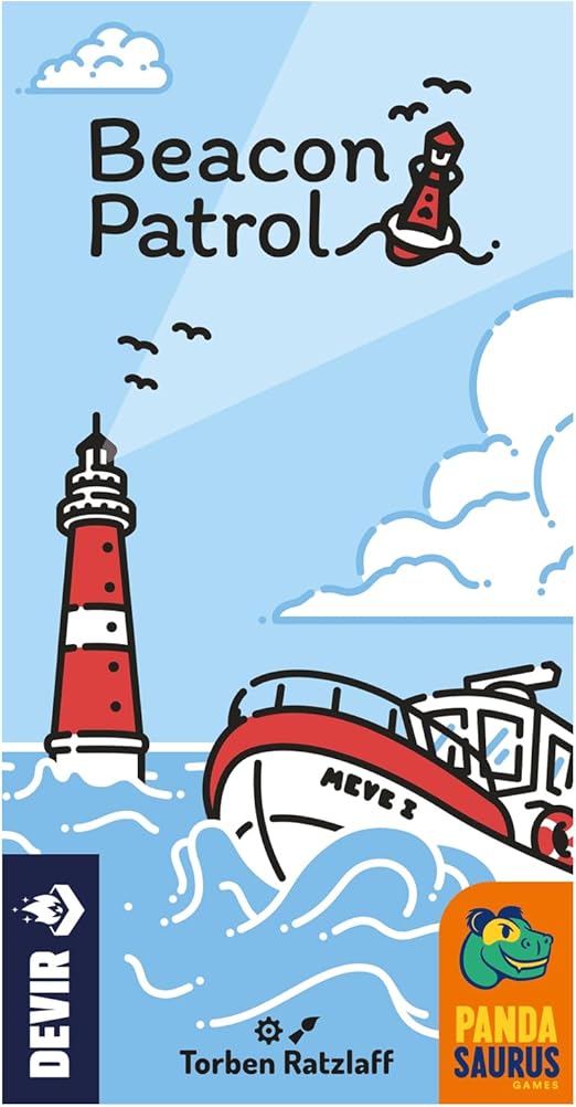 Diseñado e ilustrado por Torben Ratzlaff, Beacon Patrol se puede disfrutar en solitario o en grupos de hasta 4 jugadores, a partir de 8 años, en partidas de 30 minutos de duración. A través de mecánicas de colocación de losetas y tablero modular, colaboraréis para vigilar la mayor extensión marítima posible y para inspeccionar faros y boyas de balizamiento. Al final de la partida, puntuaréis por las losetas que hayáis explorado. ¿Preparados para patrullar la costa?
