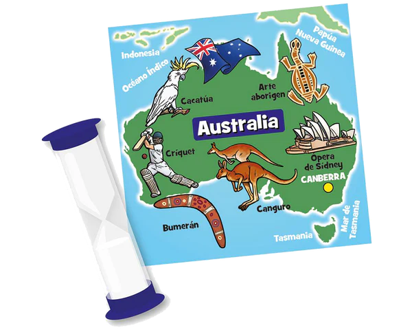 ¿Tienes memoria fotográfica? Intenta memorizar las imágenes de la carta en 10 durante segundos. A continuación, tendrás que responder a una pregunta sobre la carta que has visto, según el número que indique el dado. ¿De qué color es la cresta de la cacatúa? ¿Cuántos canguros hay? ¿Cuántas estrellas tiene la bandera?