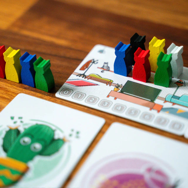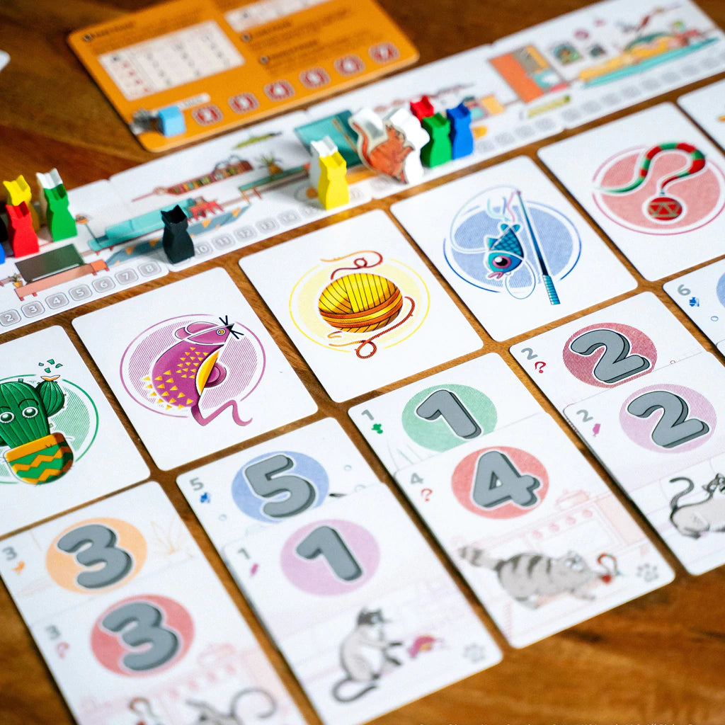 l turno consiste en jugar una carta de la mano en una columna. Es decir, debajo de los seis objetos dispuestos sobre la mesa con los que atraeremos a los gatos. Cada carta tiene un valor comprendido entre el 0 y el 6.