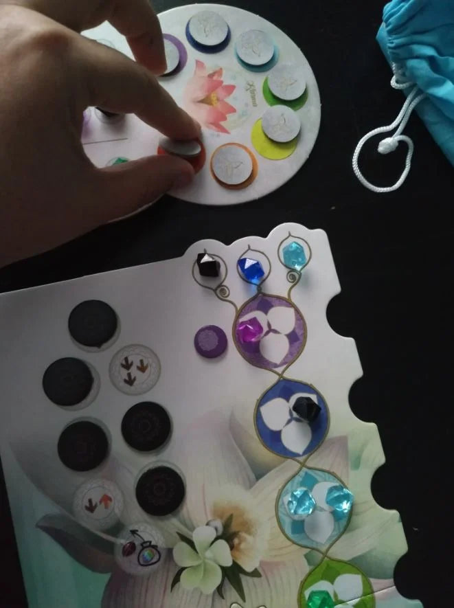En Chakra, cada persona tiene un tablero que muestra siete chakras que deben llenar con gemas que representan la energía que fluye en su cuerpo. Para ganar puntos, se deben armonizar estos chakras de la mejor manera posible, moviendo las gemas entre los chakras hasta colocar tres de ellas en el chakra correspondiente.