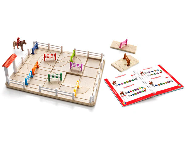 Entrenar a tu caballo para ser el mejor requiere dedicación, destreza y, sobre todo, ¡mucho cerebro! Escuela de Hípica, completa el circuito de salto ecuestre colocando las losetas para llevar a tu jinete hasta la meta. Son 80 retos que pondrán a prueba tu inteligencia y la de toda la familia. Es un juego ideal para los pequeños de 7 años en adelante, diseñado para ejercitar la mente. Cada prueba aumenta gradualmente su dificultad, así que no importa que seas un adulto, también es un gran desafío para ti. ¿Crees poder con este "juego de niños"?