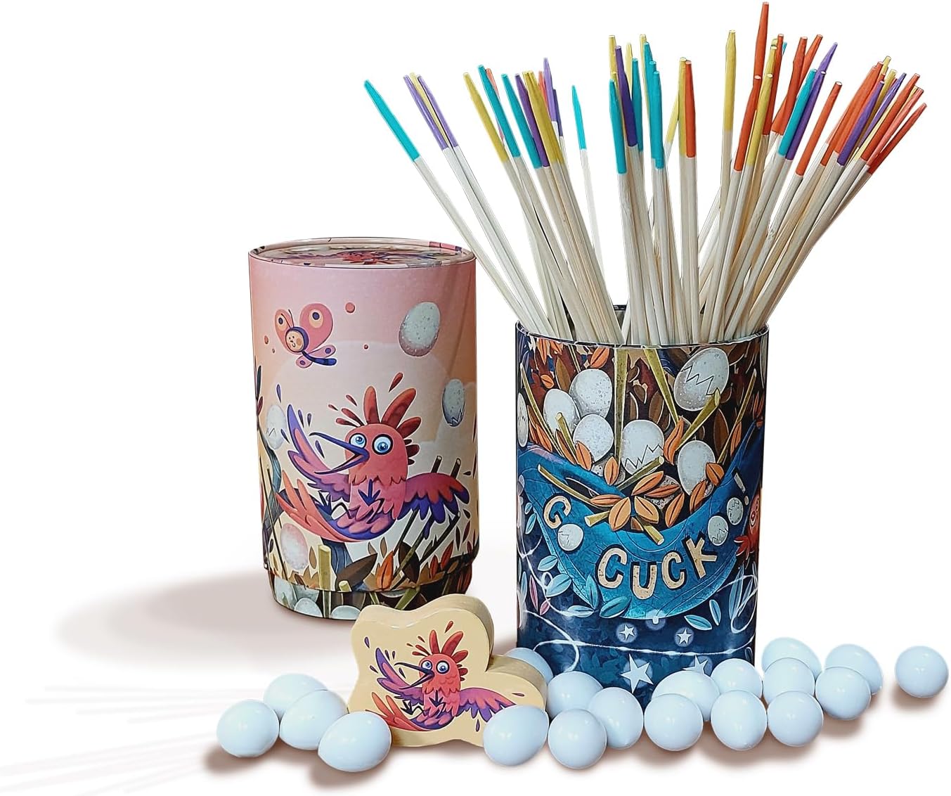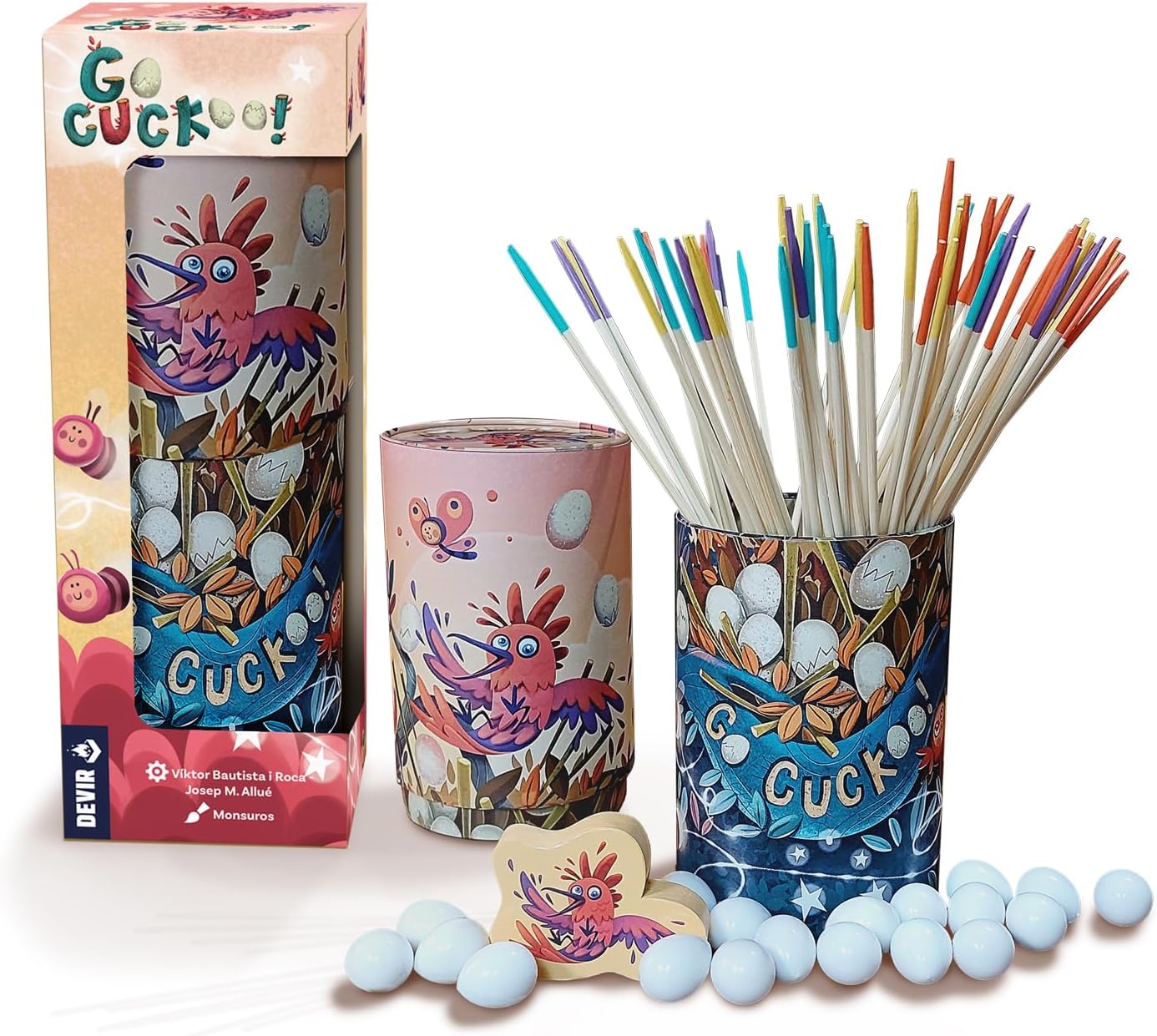 Prepara bien el pulso, ¡porque es vital en este juego de habilidad! En Go Cuckoo! los jugadores intentan construir un nido sobre una lata con bastoncillos de madera, similares a los del popular Mikado, que representan las ramas del nido. En cada turno, los jugadores deberán extraer los palitos y cruzarlos con cuidado para sustentar los huevos