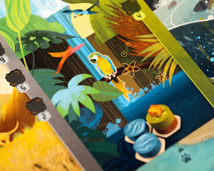 El juego incluye mecánicas de colocación de losetas y formación de patrones. Cada jugador dispone de un tablero personal donde, en cada turno, coloca piezas seleccionadas de un suministro común. Además, los jugadores pueden adquirir cartas de animales que representan patrones específicos a completar. Al cumplir estos patrones, los jugadores colocan cubos en las piezas correspondientes, acumulando puntos según las reglas del juego.