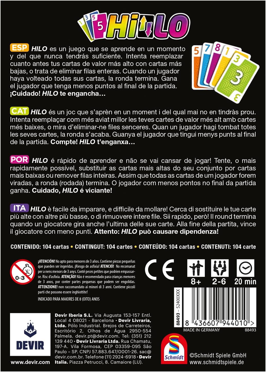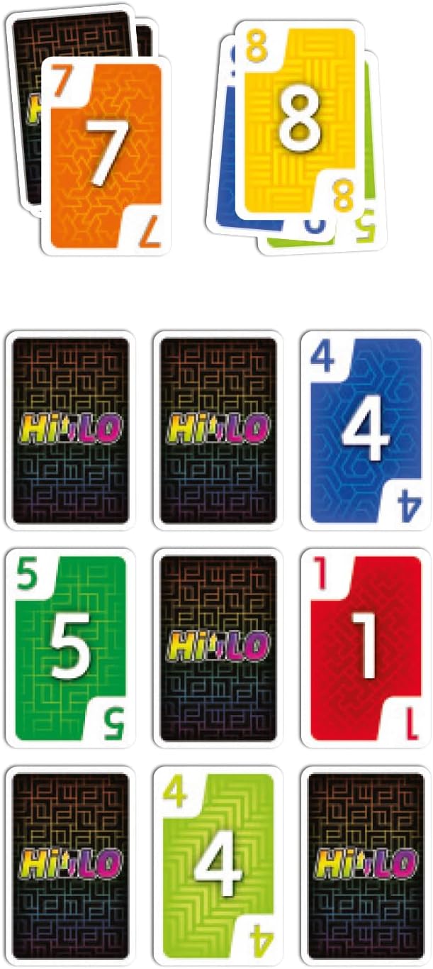 HILO es muy fácil de aprender: ¡el reglamento solo tiene 4 páginas! Al principio de la partida, cada jugador coloca nueve cartas boca abajo sobre la mesa, delante de él/ella, formando una matriz de 3×3. Con las cartas restantes se forma un mazo boca abajo, que se coloca en el centro de la mesa. Se revela la carta superior y se deja boca arriba junto al mazo: esta será la primera carta de la pila de descarte. A continuación, cada jugador revela dos cartas cualesquiera de su matriz.