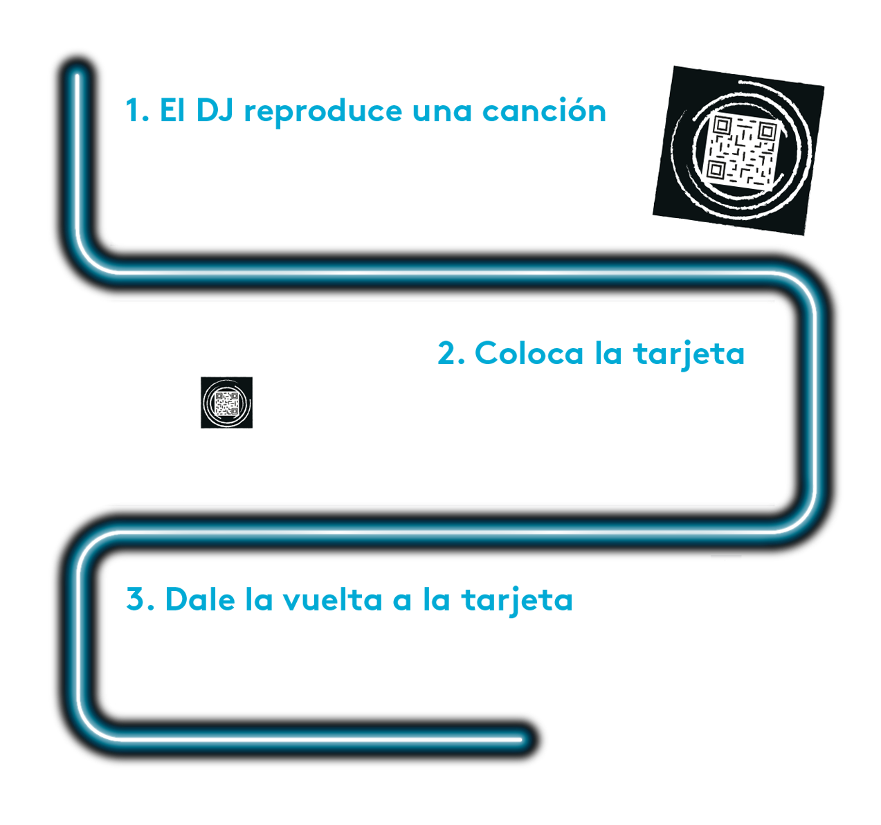 El Reto: Un jugador toma una carta, escanea el código para que suene la canción y debe colocar la carta correctamente en su línea de tiempo personal de canciones.