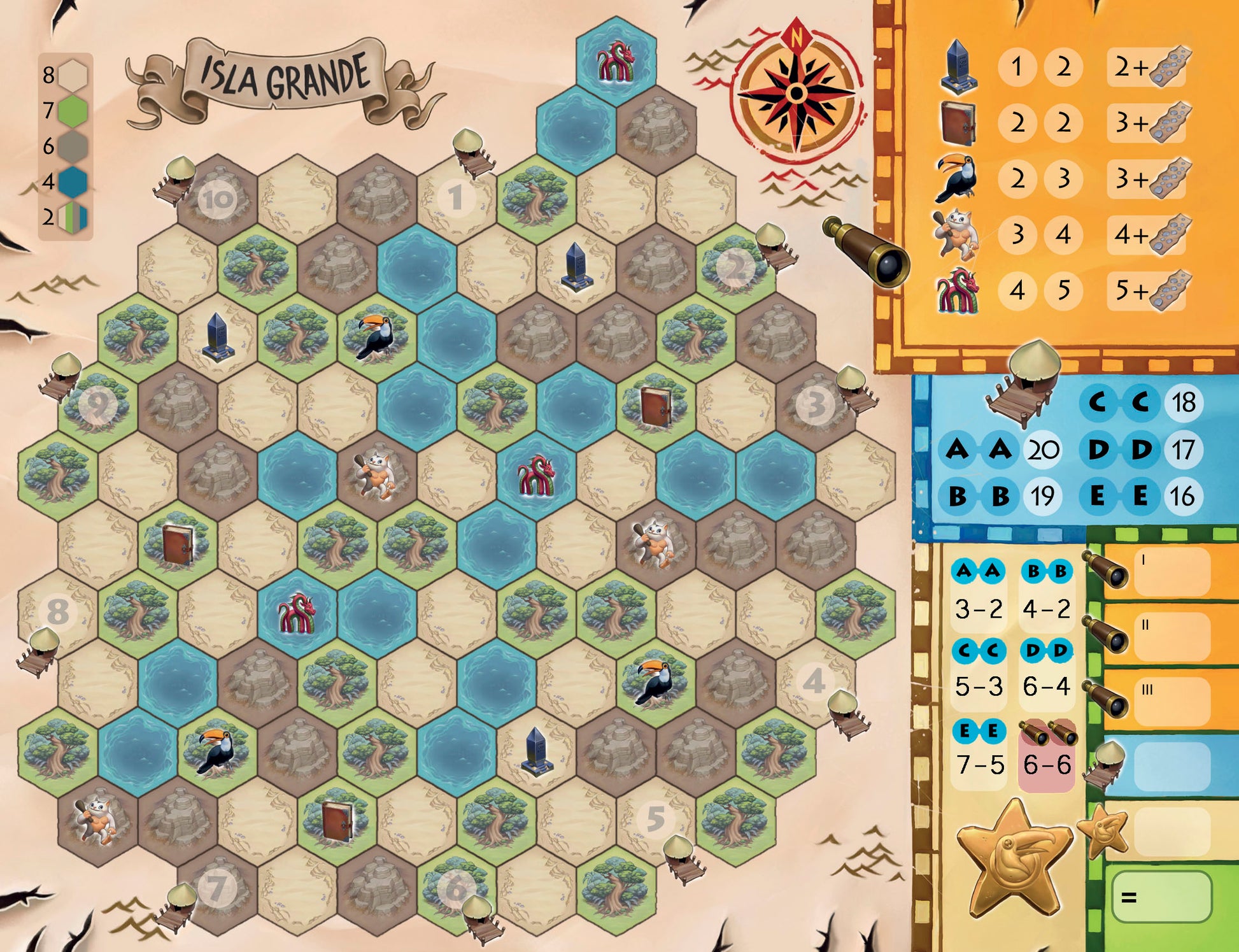 Al principio de la partida, cada jugador recibe una hoja con un mapa que muestra Poblados, Monumentos y varios tipos de terreno.