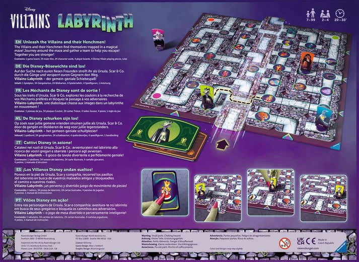 El laberinto ha sido un clásico internacional durante 35 años Ahora cuenta con villanos de Disney favoritos de los fanáticos como Maléfica, Ursula, Hades y Scar. En tu turno, cambiarás el laberinto y te moverás por el camino, tratando de llegar a los personajes de tus cartas mientras bloqueas a tus oponentes. Sé el primero en encontrar a todos tus personajes y volver a tu lugar de partida para gana