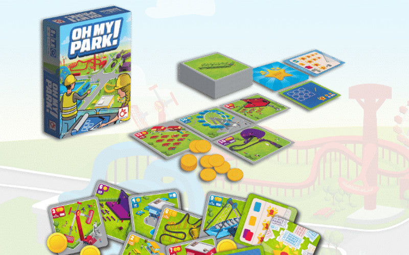 En oh my park! Irás construyendo tu parque de atracciones, según un proyecto, con las cartas que vayan pasando por tu mano. Nunca habrá dos parques iguales, así que, elige bien las atracciones y los servicios del parque, gestiona bien tu presupuesto y convierte tu obra en ¡el mayor espectáculo de la ciudad!