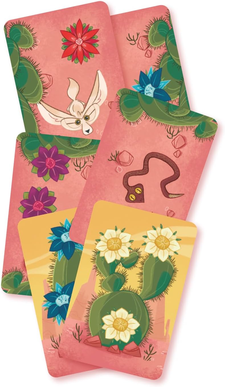 Aprender las reglas no nos llevará más de 10 minutos. Para empezar a jugar, baraja las 44 cartas de cactus y dejalas en el centro de la mesa. Roba seis cartas del mazo y ponlas en fila mostrando su reverso. Estos son los cactus que tienes a tu disposición mientras exploras el desierto. Cuantas más flores muestre el reverso, mayor será la recompensa, ¡pero también será más peligroso obtenerla!