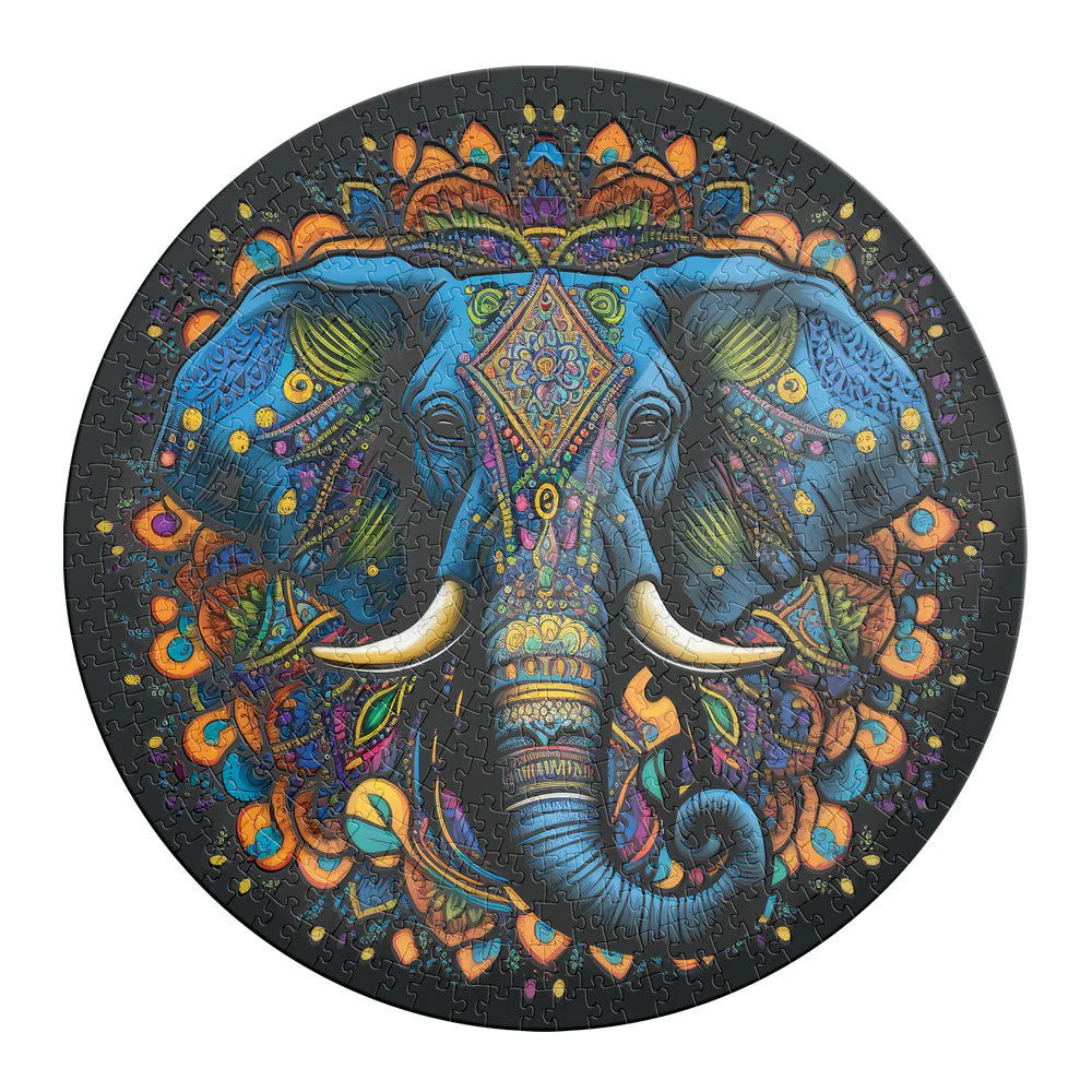 Rompecabezas Circular de 500 piezas con diseño de Elefante Mandala y barnizado en la impresión del puzzle que desafía tus habilidades de resolución de problemas y creatividad en un formato único.