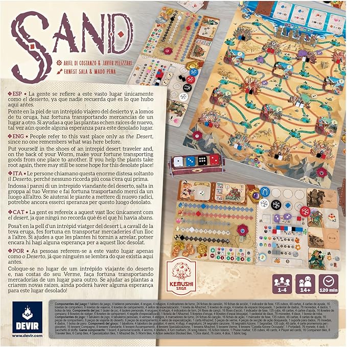 Diseñado por Ariel Di Costanzo y Javier Pelizzari e ilustrado por Ernest Sala y Mado Peña, Sand es el nuevo título de la Kemushi saga, un juego con una mecánica principal de pick-up and deliver que se puede disfrutar en solitario o en grupos de hasta 4 jugadores, a partir de 12 años, en partidas de unos 120 minutos de duración.