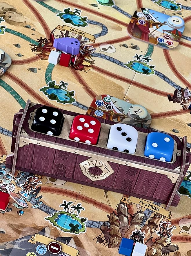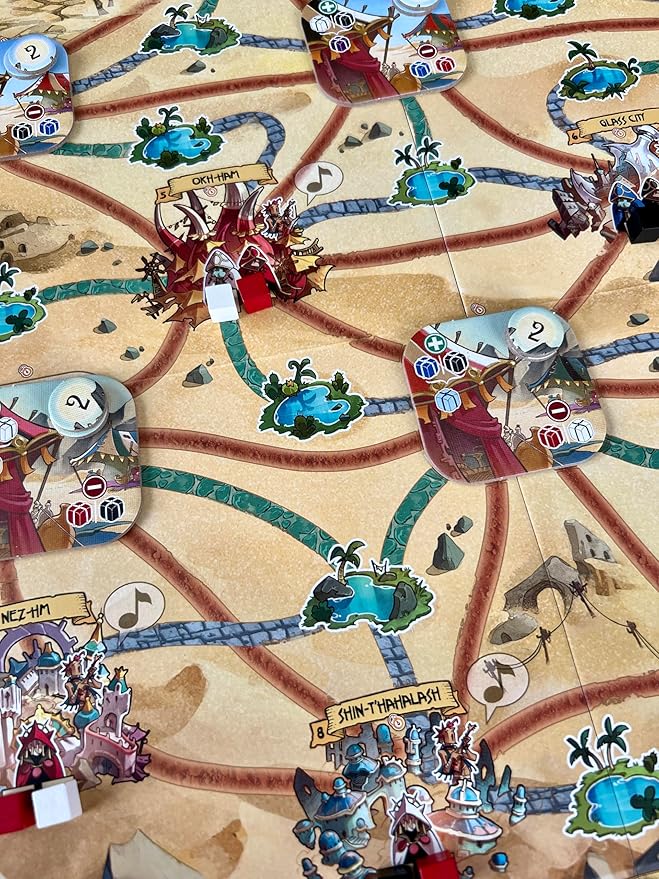 Pero no solo de oro se nutren los habitantes del desierto. En Sand también se pueden realizar oraciones para modificar resultados de un dado, ganar prestigio (cosa que nos dará oro adicional al hacer las entregas) o componer canciones en ciudades, cosa que nos bonificará cuando entreguemos mercancías allí.