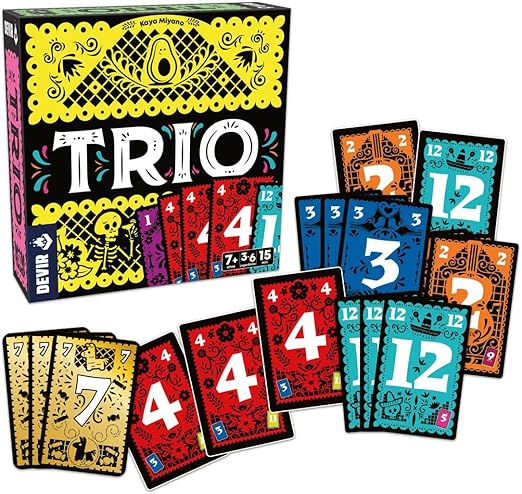 Sencillo e ingenioso, Trio es además un título muy versátil, ya que cuenta con dos modos de juego: sencillo y picante. La variante picante añade un punto de complejidad, pues hay que conseguir dos tríos conectados. Todas las cartas tienen en su parte inferior el dibujo de otra carta con un número, con el que están conectadas. El objetivo de todos en este modo de juego es conseguir tríos con estas cartas. Trio también se puede disfrutar en equipos de 2 jugadores, si se cuenta con un grupo de 4 o 6 personas. En este caso no se ponen cartas en el centro de la mesa y se reparten todas las cartas. ¡Hay un montón de formas de jugar a Trio!