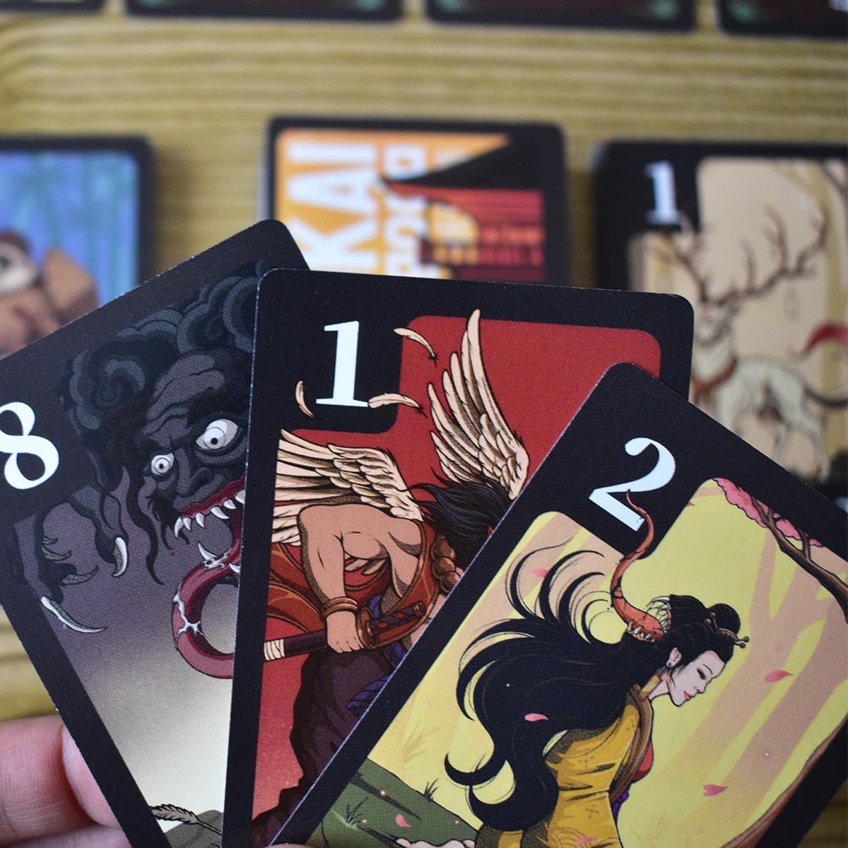 "Si juegas con el mismo Yokai o el mismo número, puedes darle a alguien una carta de tu mano. Con un Yokai diferente y un número superior puedes coger una carta al azar del mazo o la primera carta boca arriba del montón de descarte contrario. Con un Yokai diferente y un número más bajo puedes seguir con la ronda como si nada hubiera pasado o terminar la ronda actual, pero sólo si tienes una cantidad total de tres o menos puntos en tus manos. Pero… ¡sólo debes tener en cuenta la carta más baja de cada tipo de Yokai que tengas!"